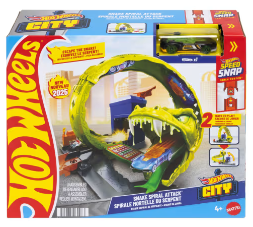 Take on a slithering snake nemesis in the Hot Wheels Snake Spiral Attack playset that features multiple ways to play.