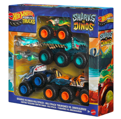 Recreate favorite moments from the Hot Wheels Monster Trucks Sharks vs. Dinos YouTube Kids series with a multipack that includes six different-sized vehicles!